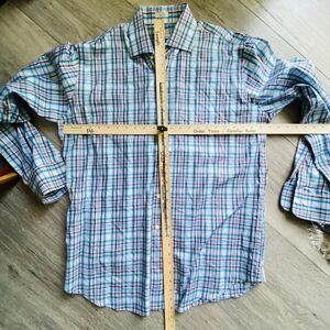 Excellent preowned condition. Beautiful lightweight Peter Millar Button Down plaid dress shirt. No issues. Ships fast