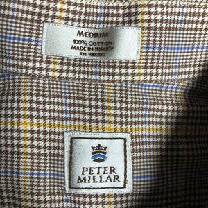 Peter Millar medium-sized shirt in brown and yellow plaid. Features a crown logo, button-down style, and a collared design. Made from high-quality cotton.