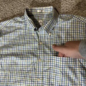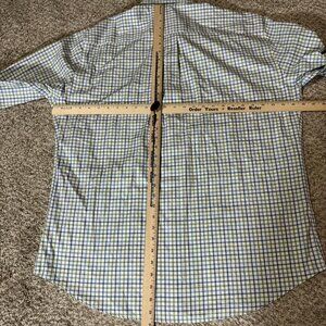 Peter Millar shirt details: Tag size Extra Large; Nanoluxe Easycare style; 100% cotton; made in China. Pattern is blue, green, and white check plaid with curved hem and button cuffs.