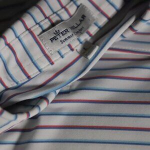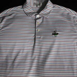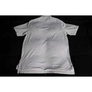 Pre-Owned Peter Millar Sumer Comfort Golf Polo Shirt Mens L White/Blue Stripe Embroidery that may exhibit minor flaws or stains.