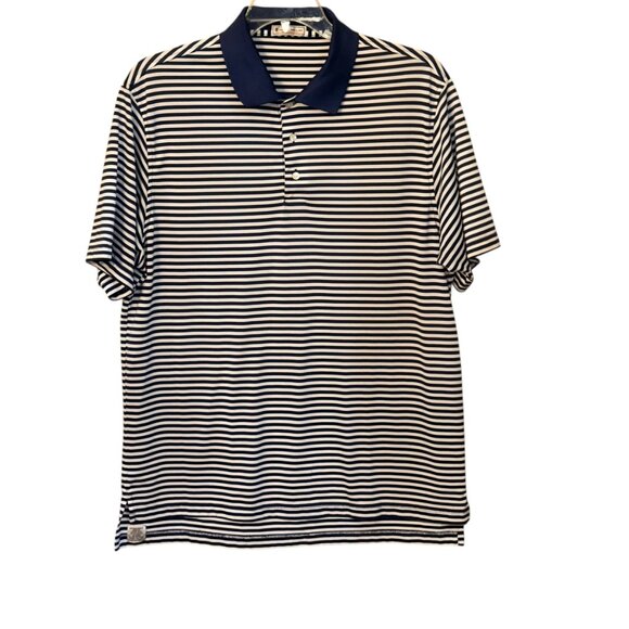 Peter Millar Summer Comfort Blue White Stripe Golf Polo Shirt Large Performance. This shirt is made of 100% Polyester. It measures Underarm to Underarm 23", Length 29". This shirt is in good, used condition. It does have slight discoloration inside the shirt. The outside does not. Otherwise, there are no rips, tears, stains or damage. Ships from a Smoke Free Home. Any questions, please ask. All reasonable offers welcome.