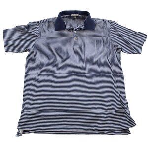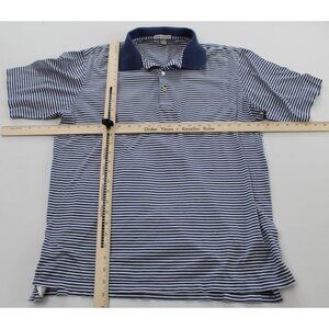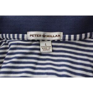 The Peter Millar Summer Comfort Men's Polo in size L is a classic and preppy collared shirt perfect for travel, activewear, and casual occasions during the summer, fall, and spring seasons. Made from a breathable blend of polyester and spandex, this polo features a spread collar, button closure, and short sleeves for comfort. The blue striped pattern adds a sporty touch, while the regular fit ensures a comfortable and stylish look. Machine washable and with a chest size of 42 inches, this polo is a versatile and stylish addition to any man's wardrobe.