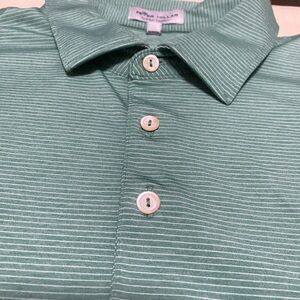 Peter Millar Summer Comfort Men’s XL Green & White Striped Short Sleeve Shirt. Good pre owned condition. See measurements below to ensure proper fit. Great summer golf shirt!