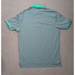 Stylish Peter Millar polo with teal and gray stripes. Comfortable and versatile for any occasion.