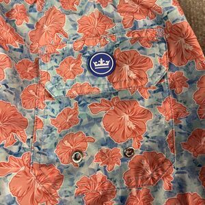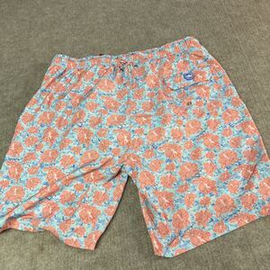 Peter Millar Seaside Collection mens swim trunks size Large in a bright, colorful floral print. Features mesh lining, drawstring waist, quick-dry fabric, and pockets. Perfect for beach vacations, pool days, or resort lounging in style.