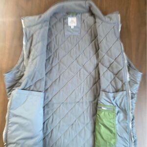 Quilted vest with side snap adjustment and interior zipper pocket. Good used condition