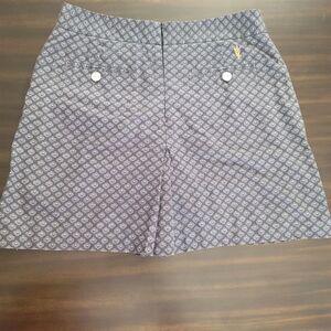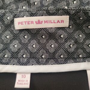 The product is a Peter Millar women's skort in size 10, featuring a black and white geometric pattern with accents of a zipper closure and moisture-wicking fabric. The skort is designed for athletic occasions such as golf, with a mid-rise fit and a short skirt length. Made from a blended fabric of spandex and cotton, it is machine washable and suitable for the summer, fall, and spring seasons. The brand, Peter Millar, is known for its designer and colorful outdoor styles, making this skort a versatile and stylish addition to any active woman's wardrobe.