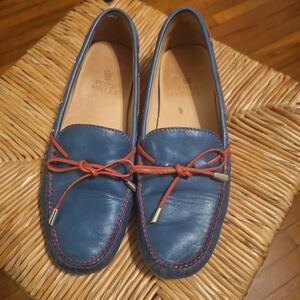 blue loafers with red laces have some wear on toes shown in pictures! good condition