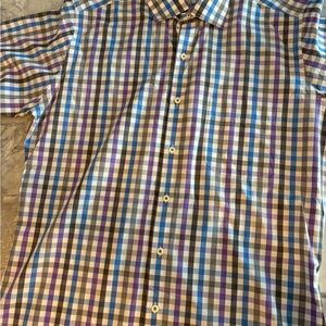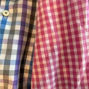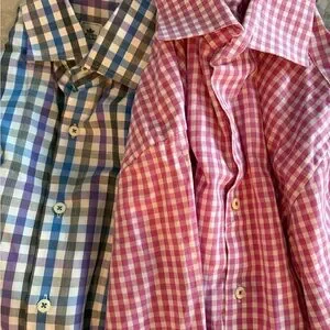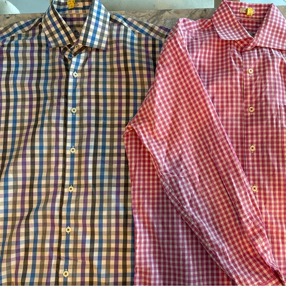Elegant checkered shirts by Peter Millar. One featured with blue, purple, gray, white and another featured with pink and white patterns. Ideal for casual outings. Gently worn, no stains, dry cleaned 1-2 times.