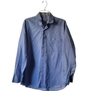 Long sleeve blue and white checker shirt. There is a light stain on sleeve shown. Not very noticeable when wearing.