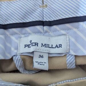 These Peter Millar men's pants feature a classic khaki color with a sleek flat-front design. The mid-rise fit and ankle-length cut offer a modern yet timeless look. Sized at 36, they provide a comfortable and tailored fit. Perfect for casual and semi-formal occasions. A versatile wardrobe staple for effortless style.