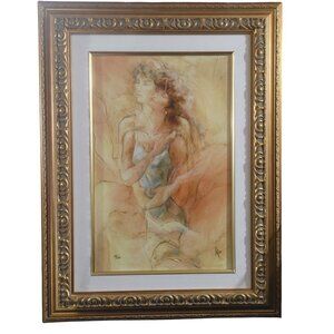 This vintage Peter Nixon artwork, "Encircled II," showcases romantic figures in soft, ethereal tones. Housed in an ornate gold frame, this piece exudes timeless charm and sophistication, perfect for enhancing traditional or antique-inspired interiors. A collectible addition to your art collection.
