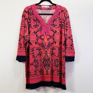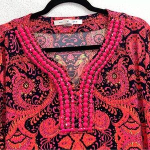 Peter Nygard 3/4 sleeve pink magenta orange beaded paisley with navy blue trim