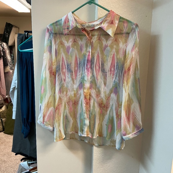 Peter Nygard 6 sheer multicolor peacock feather button collar 3/4 Sleeve Blouse