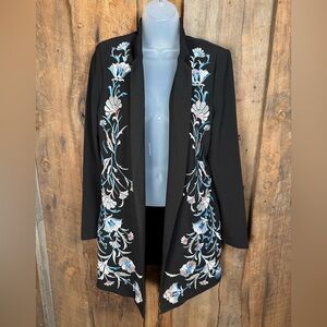 Elegant black jacket with intricate floral embroidery. Features blue, white, and cream flowers.