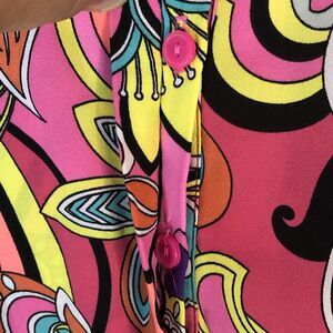 Get ready to rock the coming wave of warm weather in this Peter Nygard blouse is a bold and colorful floral print with a relaxed fit. It features a V-neckline with a rolled edge, 3/4 balloon sleeves, and a high-low hem from from to back. Made of lightweight, machine-washable polyester knit, it has hidden front buttons and single button cuffs. Suitable for various occasions, this tunic-style top is perfect for summer and spring wear.