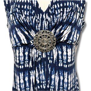 This gorgeous Peter Nygard tunic features a deep blue batik/Shibori-inspired print with soft, stretchy draping and a striking silver-tone medallion at the torso. Cool asymmetrical style. Perfect with dark skinny jeans, black leggings, or under a cropped moto jacket for winter holiday outfits.