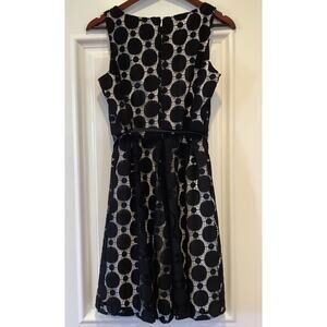 This is a white fit and flare dress in size 6 for women by the brand White. It features a black lace circles overlay on the fabric, making it suitable for casual, workwear, and business occasions. The dress is sleeveless with a zip closure and falls to knee length, perfect for summer, fall, and spring seasons. Made of polyester material, this classic-themed dress exudes a stylish and elegant vibe.