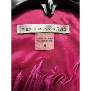 Stylish and unique Peter Nygard black blazer jacket featuring multicolor floral embroidery throughout the front, sleeves, and back. Bold pink satin lining with Nygard signature embroidery adds a luxurious pop of color. Accented with vibrant ribbon trim on the collar, hem, and front opening. Hook-and-eye front closure.