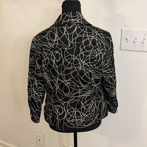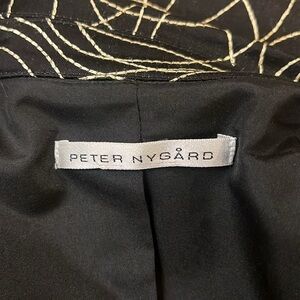 Peter Nygard Embroidered Full Zip Jacket Black Gold Accents, Sz. M/L. Size is Medium/Large based on Measurements. Jacket is displayed on a size 4 mannequin. This pre-owned jacket is the perfect jacket to wear with jeans and boots. It is also perfect for workwear or any special event or special occasion. It is very diverse. No flaws or damage. In excellent preowned condition. A beautiful addition to any closet!