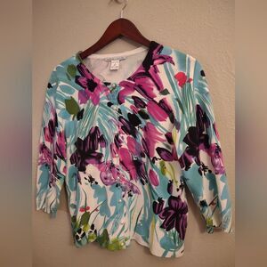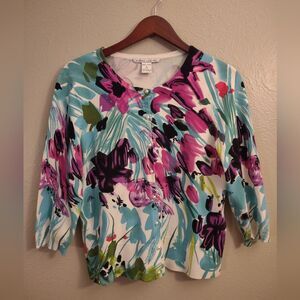 This beautiful Peter Nygard Petites cardigan combines a bold floral pattern with sophisticated details. Crafted with a soft knit fabric, it showcases a striking abstract floral design in shades of blue, purple, pink, and green. The cardigan features a flattering cropped silhouette, a classic round neckline, and a front closure adorned with delicate faux pearl buttons. The 3/4 sleeves make it a versatile piece for various seasons. A stylish and comfortable addition to any woman's closet.