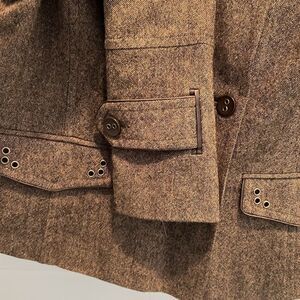 Jacket small fabric flaw under left button detail, built in shoulder pads, button closure, faux pockets, brown trim.