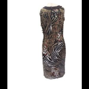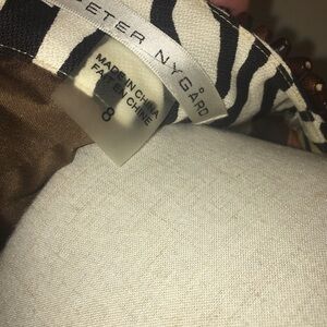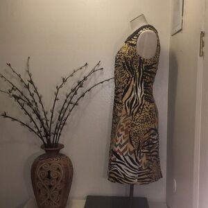 Peter Nygard Linen Animal Print Sheath Dress Size 8 Wood beaded collar design Pleating at bodice Darts down front and back for slightly fitted waist Flat lay measured pit to pit 18” across waist 17” across hips 20” length 37” all measurements are approx. 55% Linen 45% Cotton EUC
