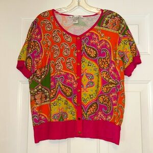 Vibrant paisley cardigan with pink, green, and orange patterns. Short sleeves and button-up front.