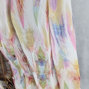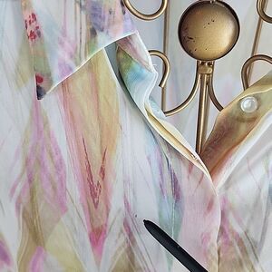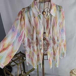Lovely, flowy, lightweight, watercolor patterned sheer button-down shacket with hidden button plaqutte. Size 12, poly, beautiful as a shirt with cami or wear open with cami, for a more flowy look. Disclosure ~ I have pin pointed a dot near collar, but can't tell if it is a part of the shirt, or a mark. it seems to line up with the golden yellow pattern.