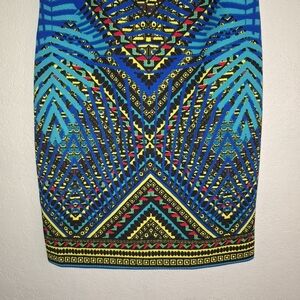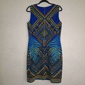 Peter Nygard Sz 10 Royal Blue Yellow Multi Color Lined Polyester Spandex Dress. Stand out in this vibrant blue dress featuring a striking geometric pattern. Perfect for any occasion.