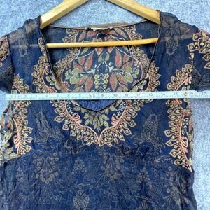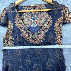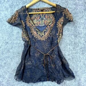 Peter Nygard Top Womens 12 Blue Floral Sheer Belted Boho Ethnic Y2K Indie Folk