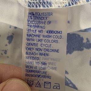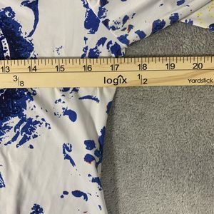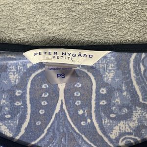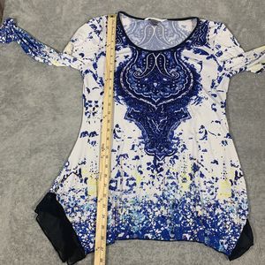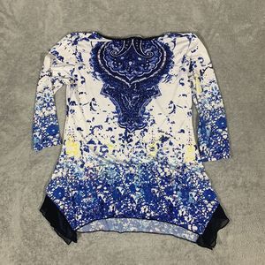 Peter Nygard Tunic Top Jeweled Blue White Damask 3/4 Sleeve Size PS