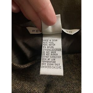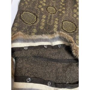 This Peter Nygard skirt is a vintage A-line style made from a wool blend material with intricate embroidery and textured brocade details in brown and gold colors. It features a removable fur trim and a zip closure. The knee-length skirt has a mid-rise fit and is lined for added comfort. Ideal for various occasions such as travel, weddings, parties, and workwear, this versatile piece embodies themes like retro, bohemian, and tribal, making it a unique and stylish addition to any wardrobe.