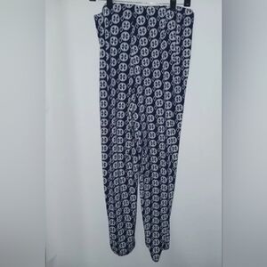 Description: Peter Nygard Womens Blue and white geometric all over pattern Palazzo Pull On Wide Leg Pants Stretch Elastic Waist. Polyester blend and spandex material. Elastic Waist, Stretch. Casual, Beach, Travel wear.