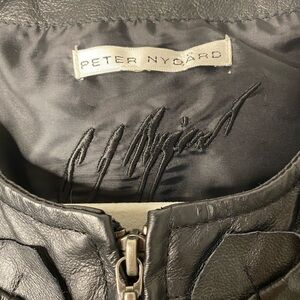 Women’s Peter Nygard Faux leather black jacket w/floral design. No size on jacket but seems like a large. Material on the arms and back is a stretchy material. Has thin shoulder padding