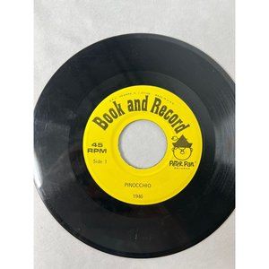 This vintage vinyl record and book set from Peter Pan Records features the classic story of Pinocchio, narrated with music and sound effects. The 7" record plays at 45RPM and is made of durable vinyl material. Released in 1946, this collectible item is a must-have for any music or book enthusiast.