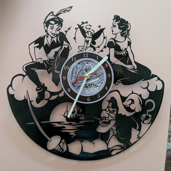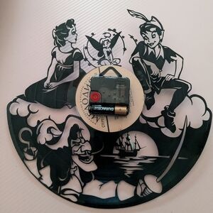 handmade Peter Pan clock made from an old record super cool piece for Disney fans there's a hook on the back to hang it up clock still works perfectly