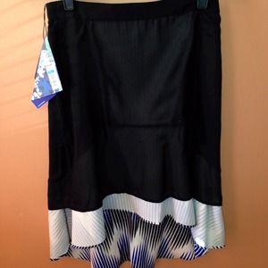 Black, blue, and white high-low skirt in poly with 10% spandex. The material is really nice, and the skirt is lined (see last photo, inside out).