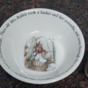 Charming Peter Rabbit bowl and cup set. Features delightful illustrations and text. Perfect for adding a touch of whimsy to your home.