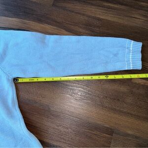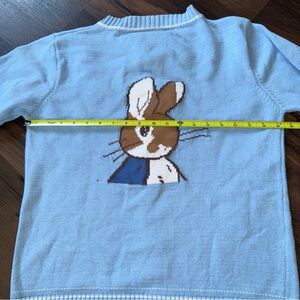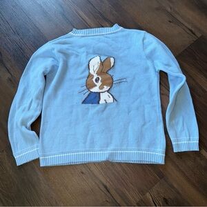 Baby blue Peter Rabbit embroidered cardigan. Adorable detailing with wooden buttons. Preowned condition with some signs of wear/use. One small black spot noted on back of left sleeve. See all pics!