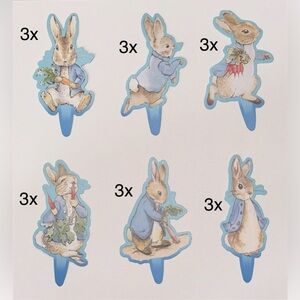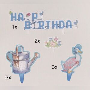 Set of 27 Peter Rabbit themed cake toppers. Features 26 adorable cupcake toppers and 1 floral “Happy Birthday” cake topper.