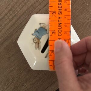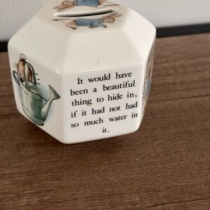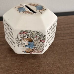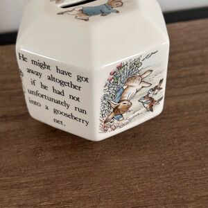 Charming ceramic money box money bank featuring Peter Rabbit design. Cream color with delightful illustrations.