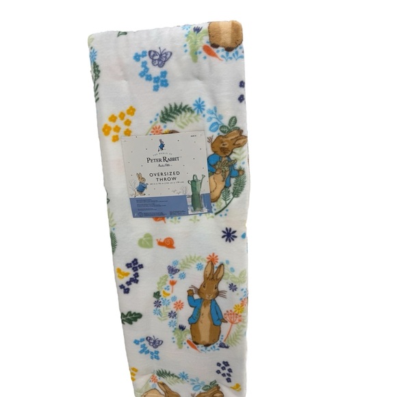 Soft fleece blanket featuring Peter Rabbit design. Cream base with blue and brown accents. Peter Rabbit Blanket soft plush blanket NEW