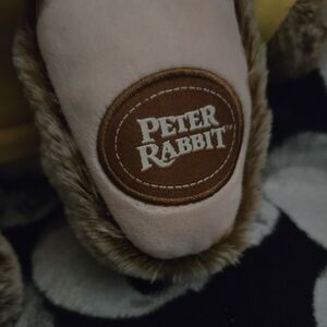 Adorable brown/tan peter rabbit plush toy wearing a yellow hoodie and blue jean style vest. Perfect for kids & adults who love cuddly plush toys!