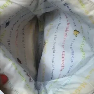 Very Good Condition, Canvas, cute Fluffy ball tail. Lining is text from book 5" strap drop. Approx 8.5x12”