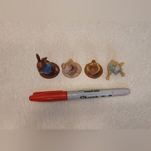 Set of 4 Peter Rabbit-style toy figures, great for imaginative play or as decorations. Each bunny is dressed in a different colorful outfit and stands upright. Perfect for kids who love animal characters, or as an addition to a Peter Rabbit-themed collection.
