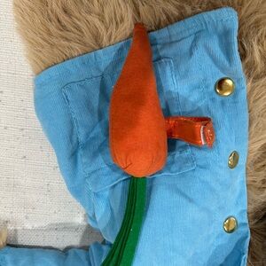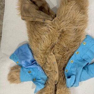 Plush jacket with blue exterior and tan faux fur lining. Snap button closure.