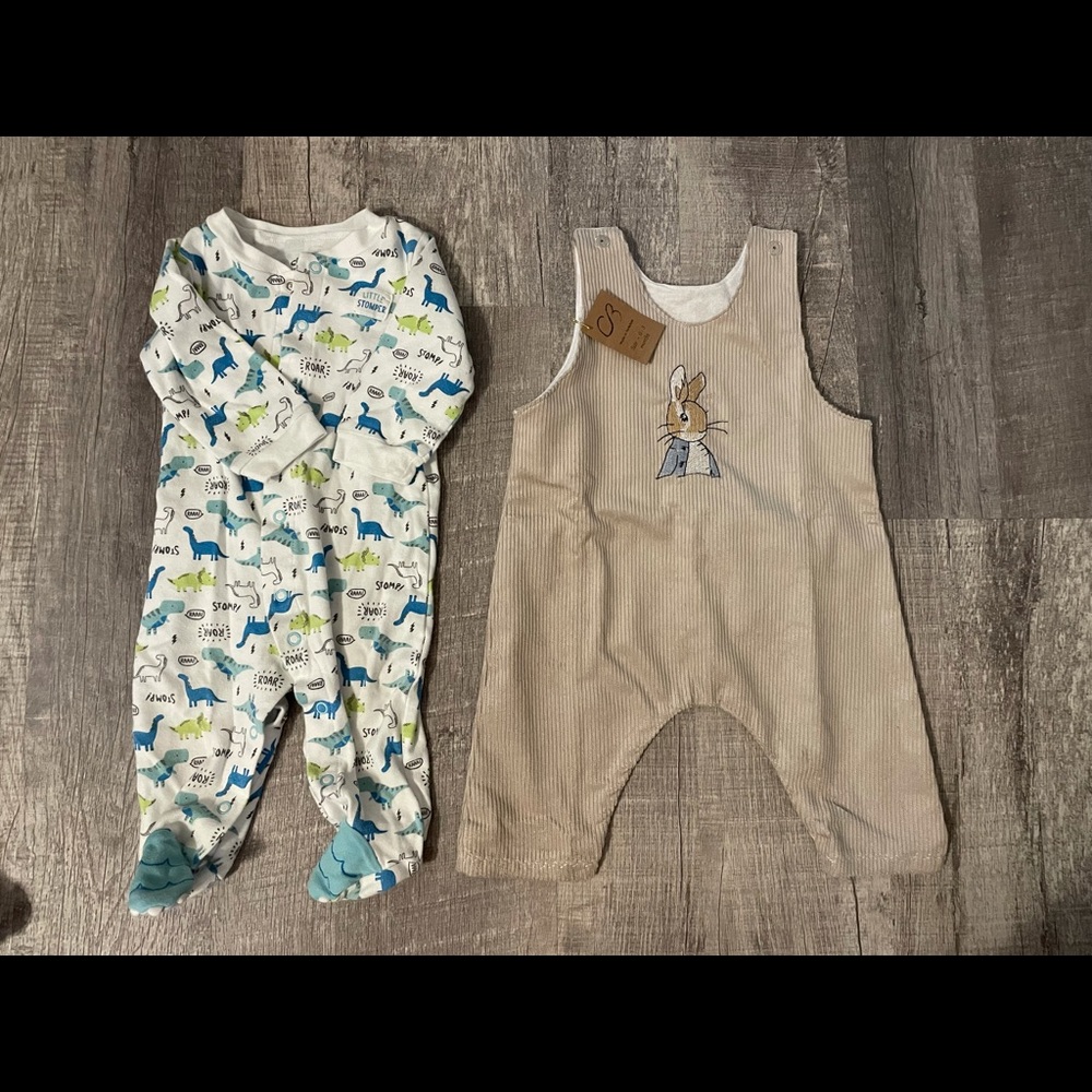 Peter Rabbit jonjon. Size 0-3 but looks more like a 6-9. Pictured next to a 6-9 onesie for comparison.