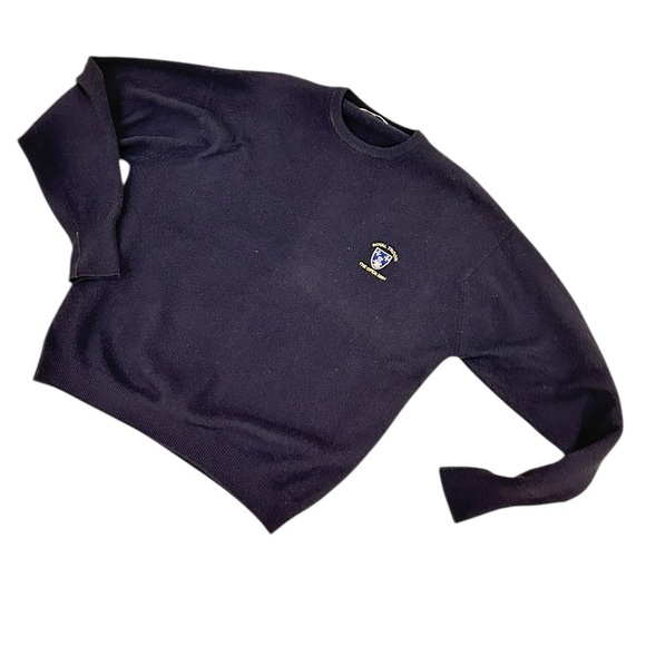 Elegant navy blue 100% Lambswool crewneck sweater by Peter Scott. Made in Scotland. Royal troon the Open 2004 embroidered on chest. Ideal for a cozy and stylish look. One of a kind. Golf. Ribbed hems. Euc