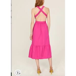 Romantic fit and flare designer midi dress is wedding guest resort-ready, in a crisp cotton poplin fabric, apron style straps and tiered ruffle, halter neckline in bright Barbie pink. Boho, romantic, vacation, birthday, graduation, resort cottagecore , tomatoegirl vibes from this gorgeous dress.